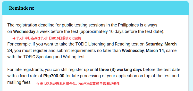 フィリピンTOEICの申し込み締め切りはテストの10日前まで。