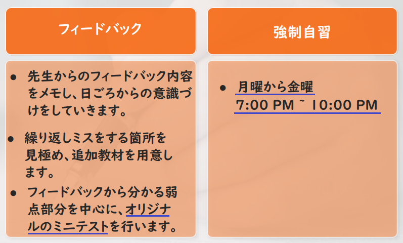 通常TOEICコースは、マンツーマン4コマ・グループ4コマのスケジュール。