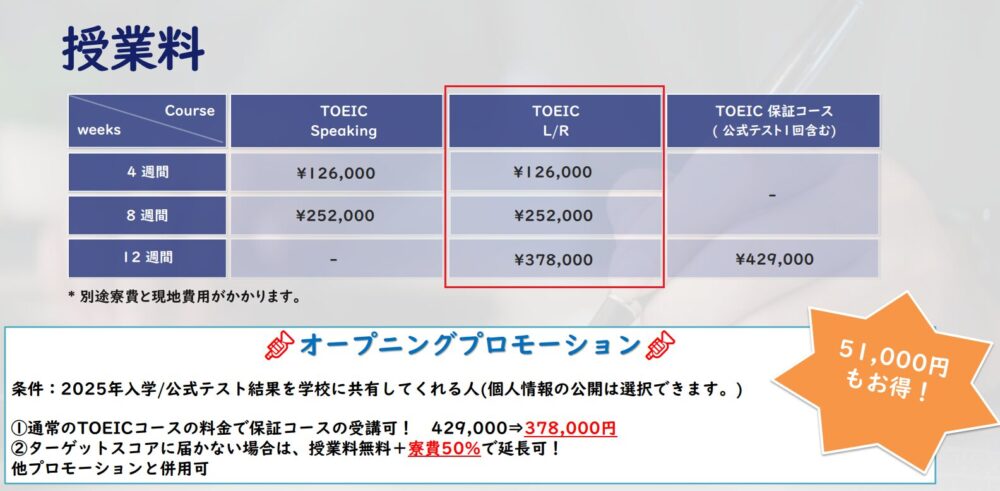 もともとIELTSで有名な学校でしたが、TOEIC対策もできるようになり、さらに受けが広い学校となっていますね。