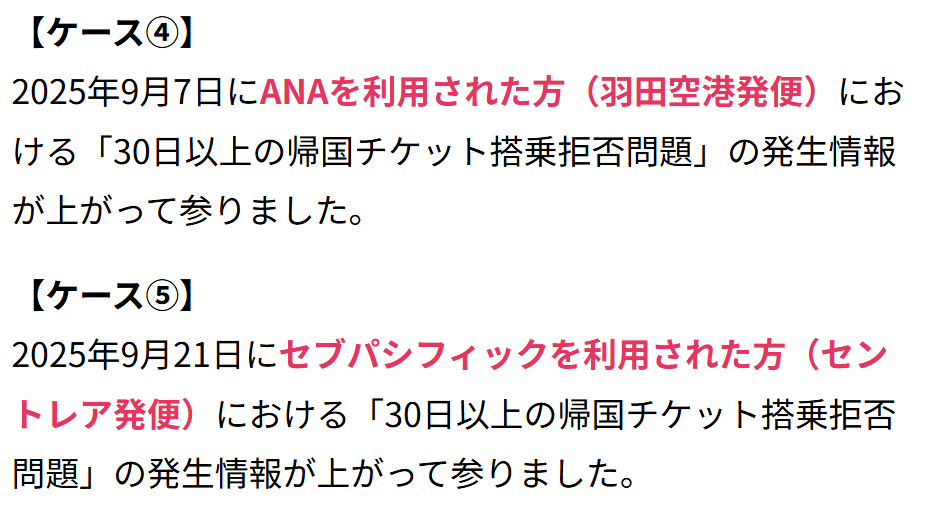 ところが今年9月、羽田空港発ANA便、およびセントレア空港発セブパシフィック便で搭乗拒否問題が発生したようです。