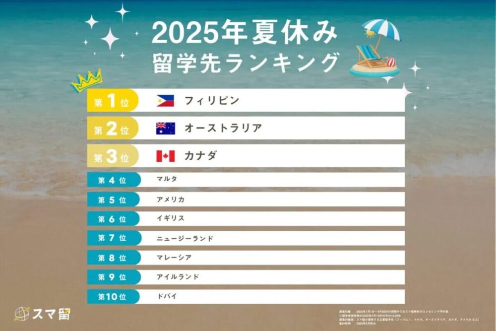 同じくスマ留より、『2025年 夏休みの留学件数ランキング』も見てみましょう。